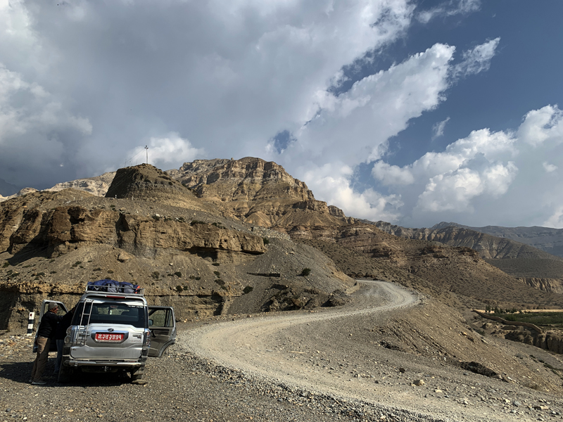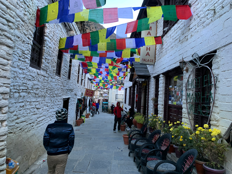 For decades, Marpha (in the Mustang region) has been popular for the Marpha Brandi (Whisky), which is produced by the Himalayan apples in the local area. If you travel there in the season, you will see the picturesque apple orchards on the highway. Another feature of this thrilling road drive is the windy Kali Gandaki River valley, which creates challenges for travelers after the mid-day. Daring to walk a few kilometers through this River valley is rewarding as well. On our last trip, we were almost blown away by the winds when we tried to face the wind.